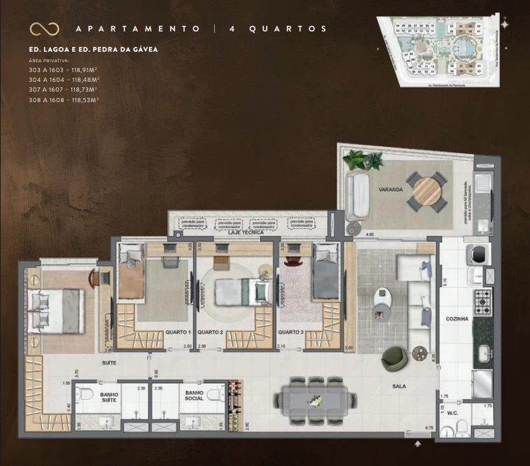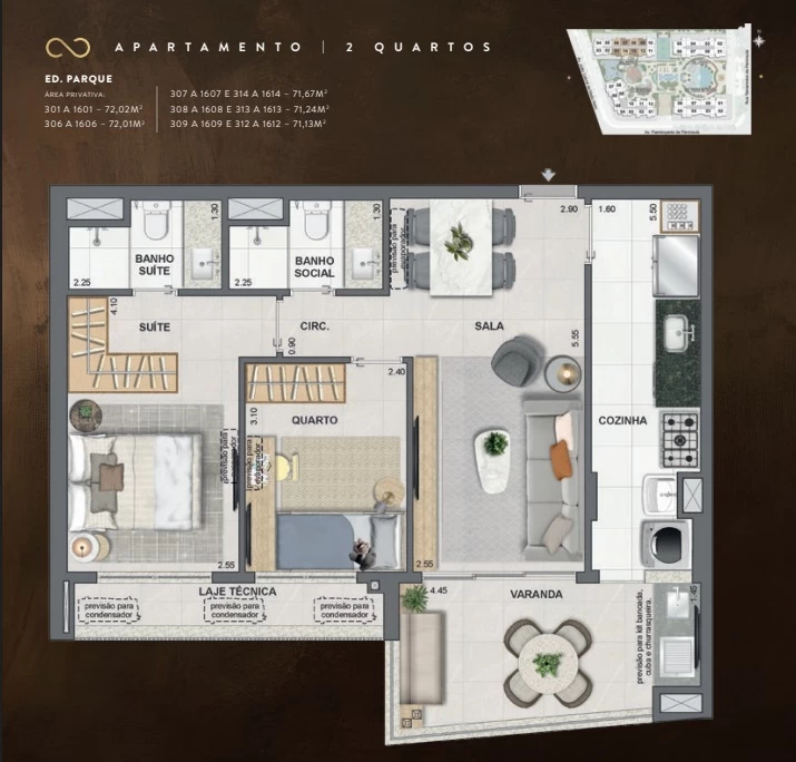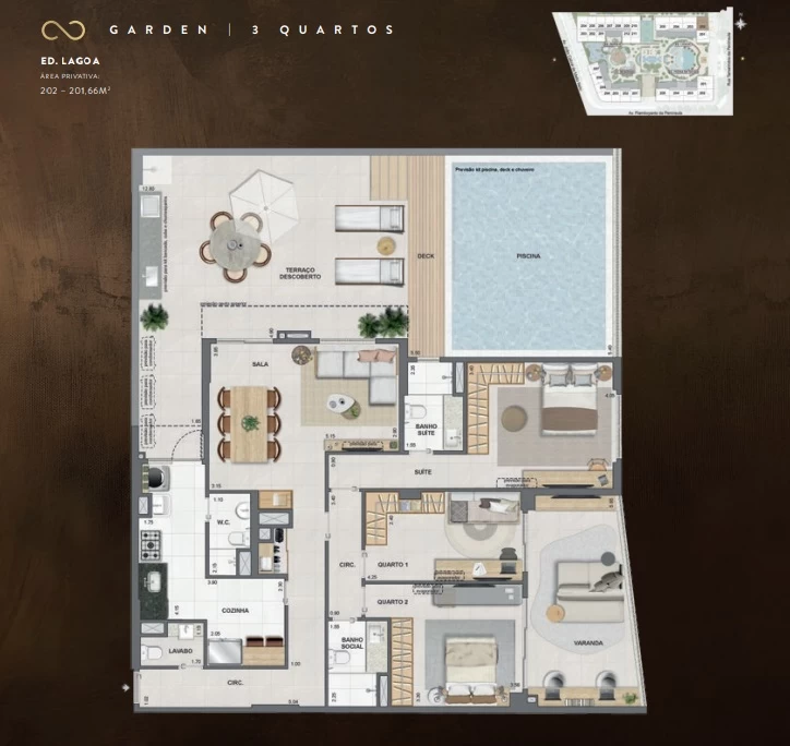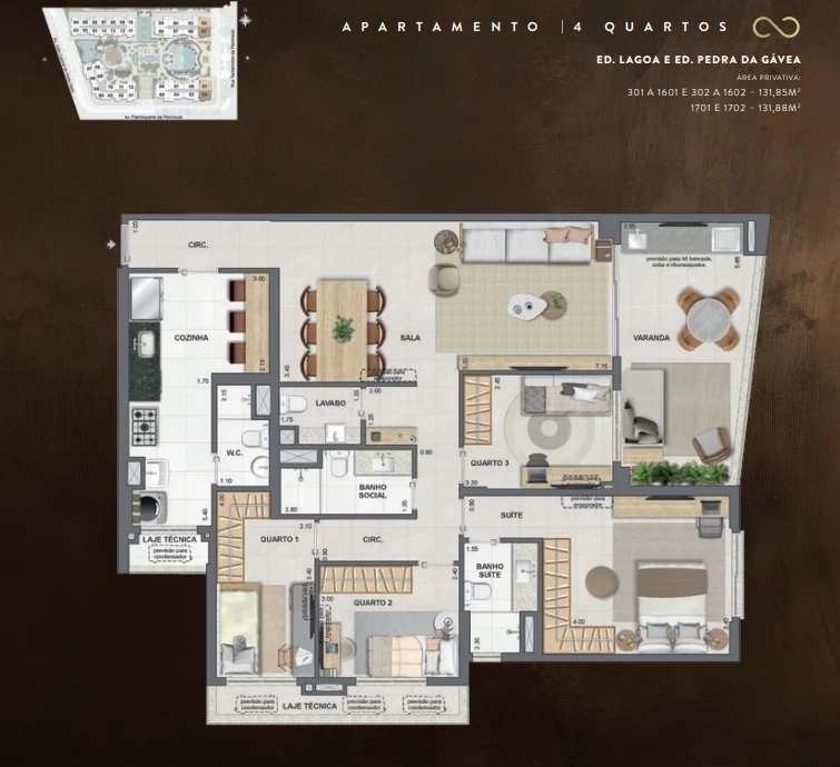 Garden de 2 quartos com 135m² / Gardens de 3 Quartos com164m² e 261m² / Gardens de 4 Quartos com 208m² / Apartamentos de 2 Quartos com 71m² / Apartamentos de 3 Quartos com 92m² / Apartamentos de 4 Quartos com 118m² e 131m² / Coberturas duplex de 3 Suítes com 150m² a 152m² / Coberturas de 4 Suítes com 200m² a 264m².