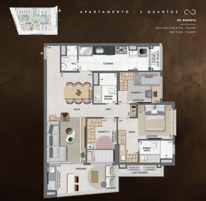 Apartamentos de 3 Quartos com 92m².