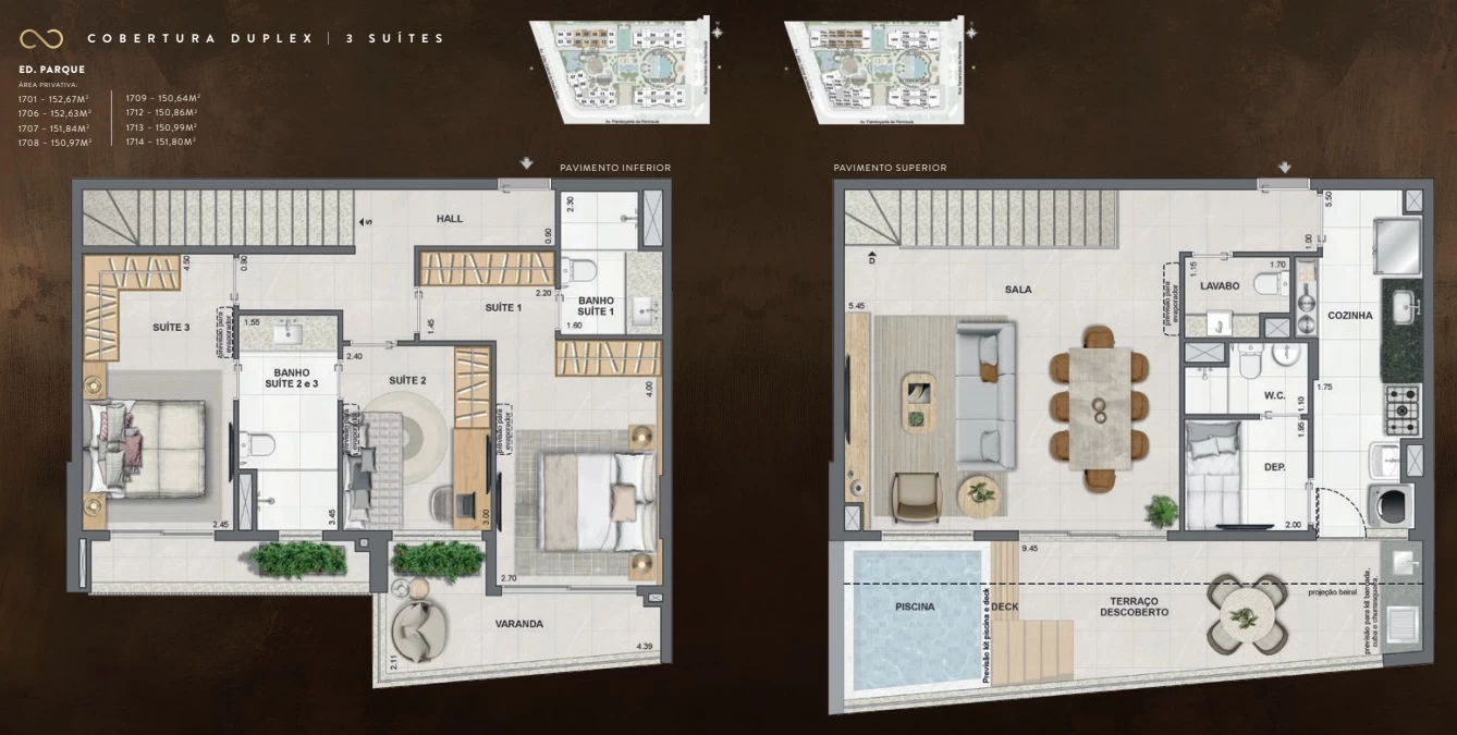 Coberturas duplex de 3 Suítes com 150m² a 152m².